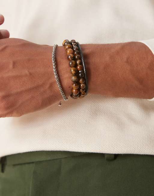 ASOS DESIGN beaded and faux leather 4 pack bracelet in brown
