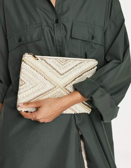 ASOS DESIGN beaded clutch bag in off white and gold