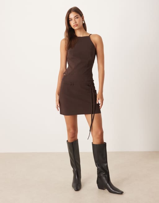 ASOS DESIGN bengaline fitted mini skirt with tie detail in chocolate