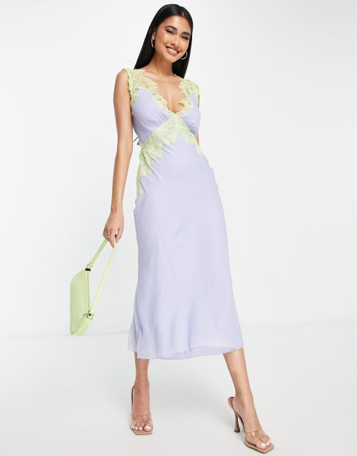 ASOS DESIGN bias cut chiffon midi dress with applique lace in lilac