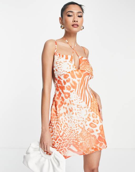 ASOS DESIGN bias soft mini dress with tie front detail in stone animal print