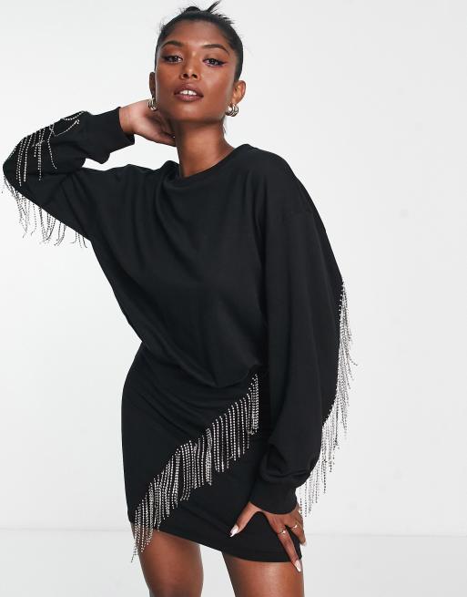 ASOS DESIGN bodycon mini sweat dress with diamante fringing in black