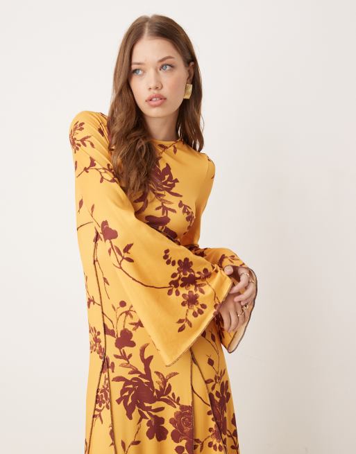 ASOS DESIGN boho floral print peach long sleeve midaxi dress