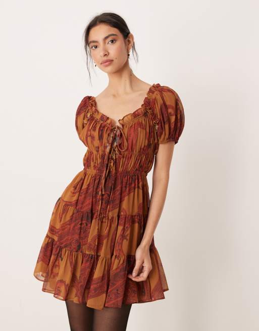 ASOS DESIGN boho ruffle puff sleeve mini dress in rust paisley