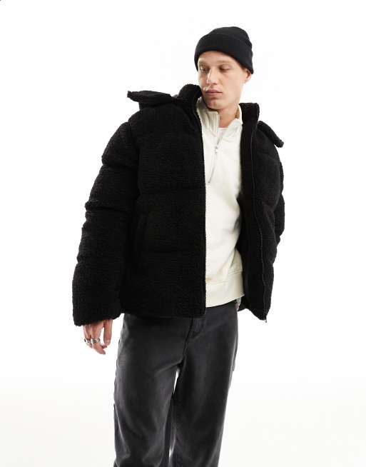 ASOS DESIGN borg puffer jacket with removable hood in black