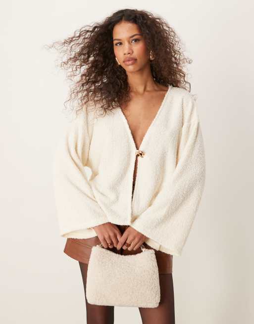 ASOS DESIGN boucle rib cardigan with gold detail button in cream