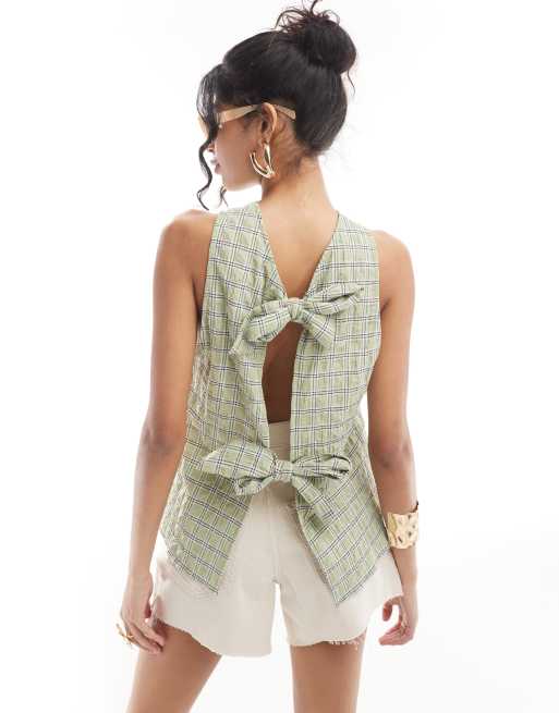 ASOS DESIGN bow tie back top in green check