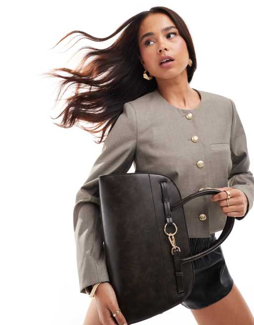 ASOS DESIGN bowler tote bag with dog clip in washed brown