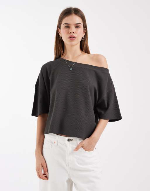ASOS DESIGN boxy off shoulder waffle t-shirt in charcoal
