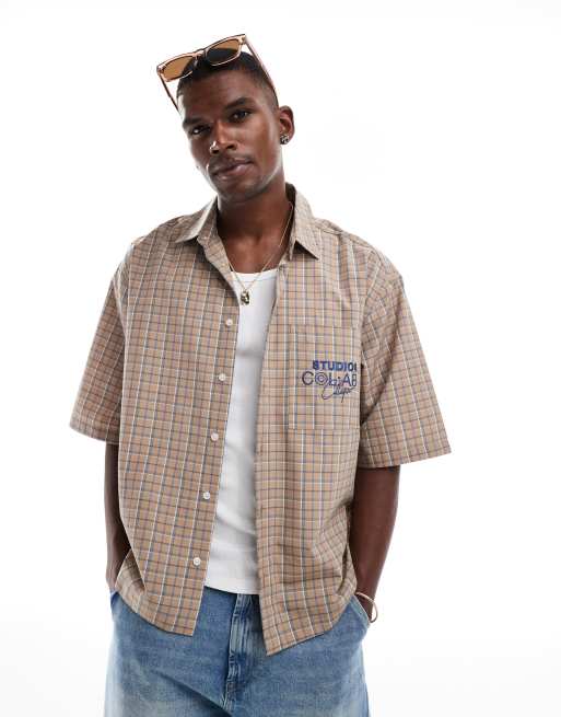 ASOS DESIGN boxy oversized check shirt with chest print in brown