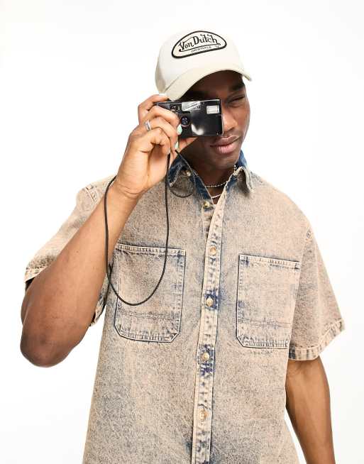 ASOS DESIGN boxy oversized denim shirt with pink tint dirty wash