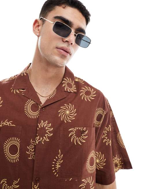 ASOS DESIGN boxy oversized revere linen look shirt with tobacco sun print