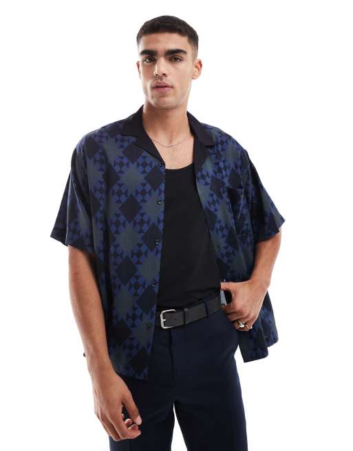 ASOS DESIGN boxy oversized revere shirt with diamond geo print in blue
