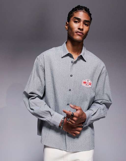 ASOS DESIGN boxy oversized shirt in navy check with chest badge