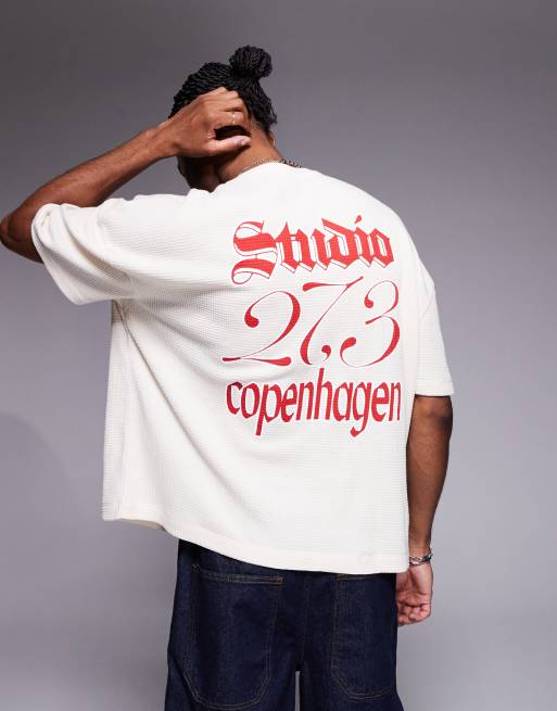 ASOS DESIGN boxy oversized t-shirt with dropped shoulder and text graphic in beige waffle