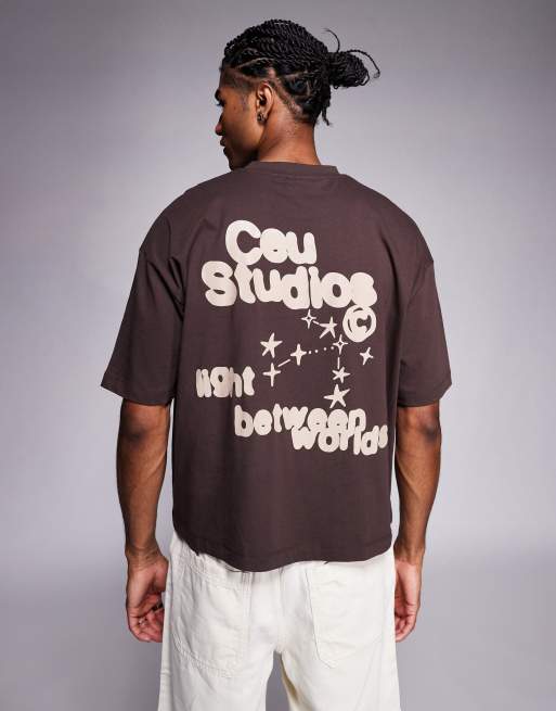 ASOS DESIGN boxy oversized t-shirt with front and back text print in brown