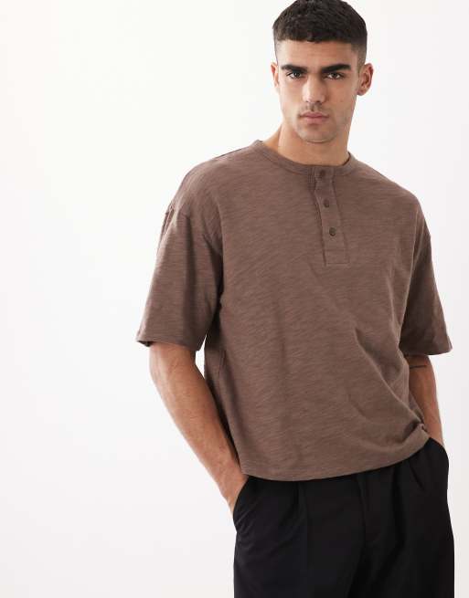 ASOS DESIGN boxy oversized t-shirt with henley neck in brown slub.