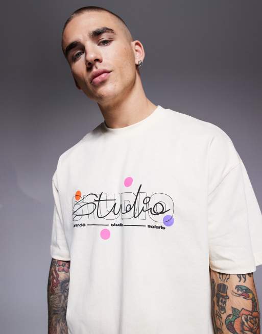 ASOS DESIGN boxy oversized t-shirt with puff text graphic in buttermilk