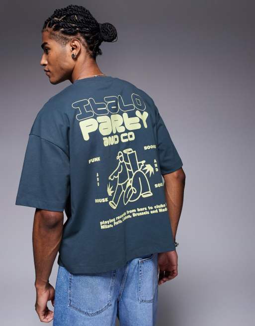ASOS DESIGN boxy oversized t-shirt with text graphic in grey blue