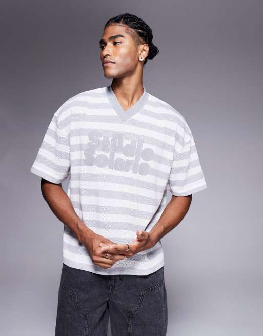 ASOS DESIGN boxy oversized t-shirt with v-neck and text graphic in textured stripe