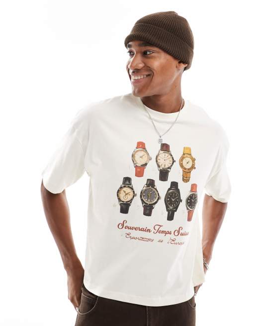 ASOS DESIGN boxy oversized t-shirt with watches graphic in off white