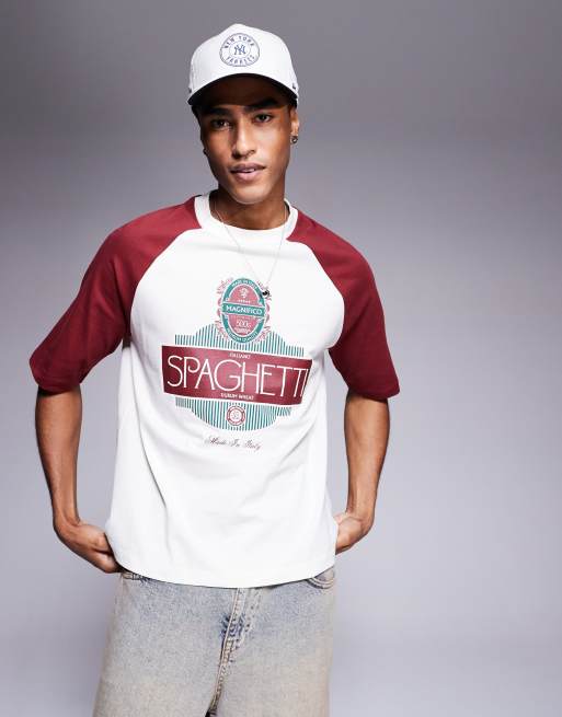 ASOS DESIGN boxy relaxed raglan t-shirt with text graphic in cream and red