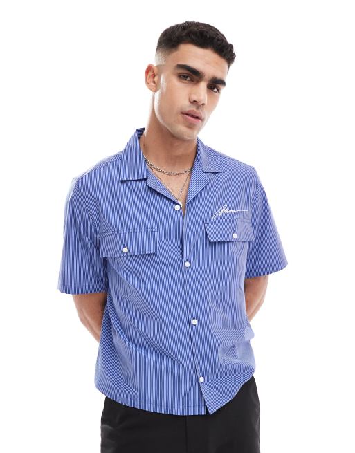 ASOS DESIGN boxy relaxed revere stripe shirt with chest embroidery in blue
