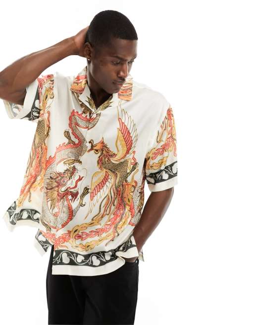ASOS DESIGN boxy revere trapped satin shirt with Phoenix placement