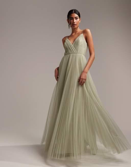 ASOS DESIGN Bridesmaid cami pleated tulle maxi dress in sage