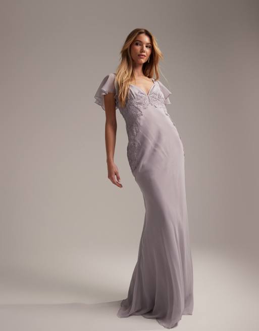 ASOS DESIGN Bridesmaid flutter sleeve maxi dress with lace detail and bias cut skirt in lilac