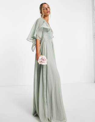ASOS DESIGN Bridesmaid ruched bodice drape maxi dress with wrap waist and flutter cape sleeve in olive