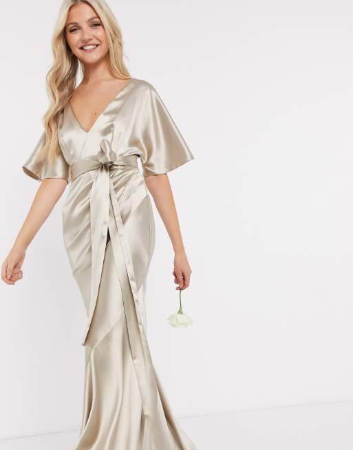 ASOS DESIGN Bridesmaid satin kimono sleeve maxi dress with panelled skirt and belt in Oyster