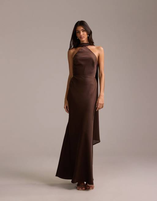 ASOS DESIGN bridesmaids halter neck satin maxi dress with scarf detail in chocolate