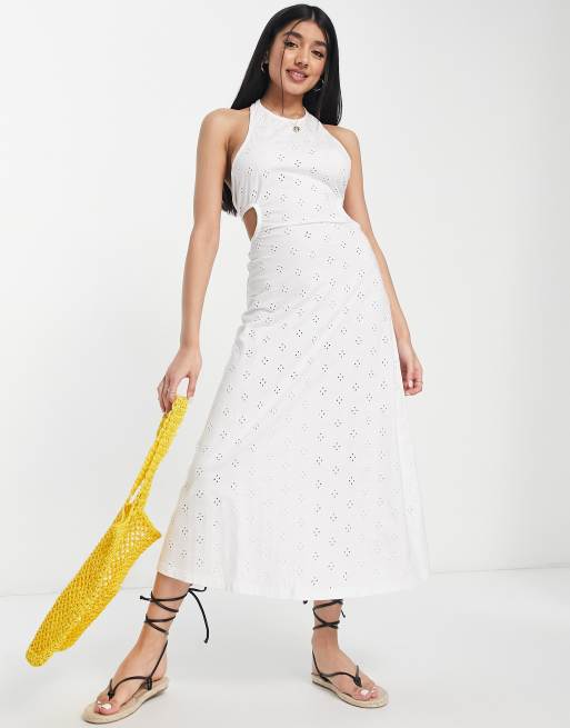 ASOS DESIGN broderie open back high neck midi dress in white