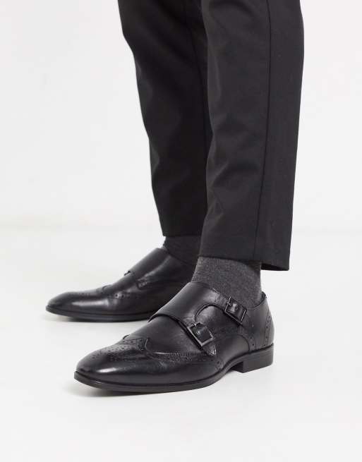 ASOS DESIGN brogue monk shoes in black leather