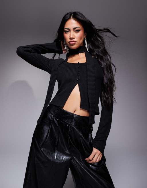 ASOS DESIGN brushed rib button down square neck long sleeve top with scarf in black
