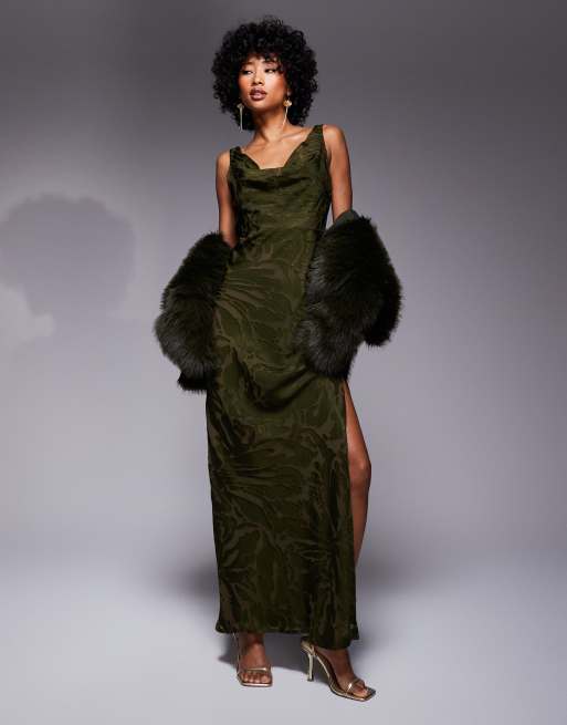 ASOS DESIGN burnout cowl double layer tie detail maxi dress in dark khaki