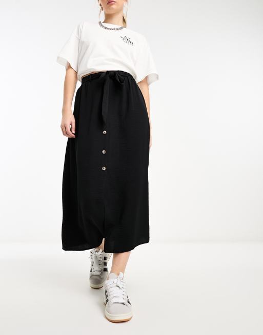 ASOS DESIGN button through midi skirt with tie waist in black