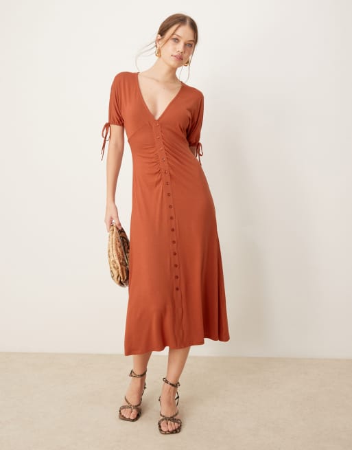 ASOS DESIGN button through midi tea dress with tie sleeve in red
