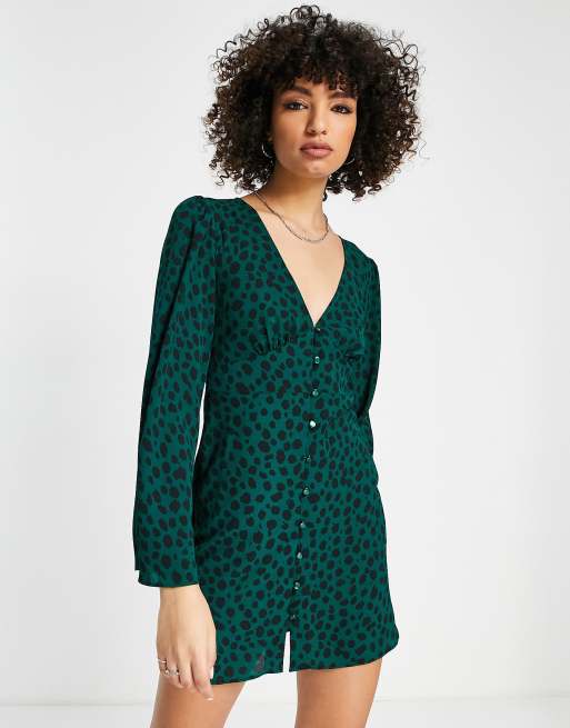 ASOS DESIGN button through mini dress with 70s sleeve in green animal print