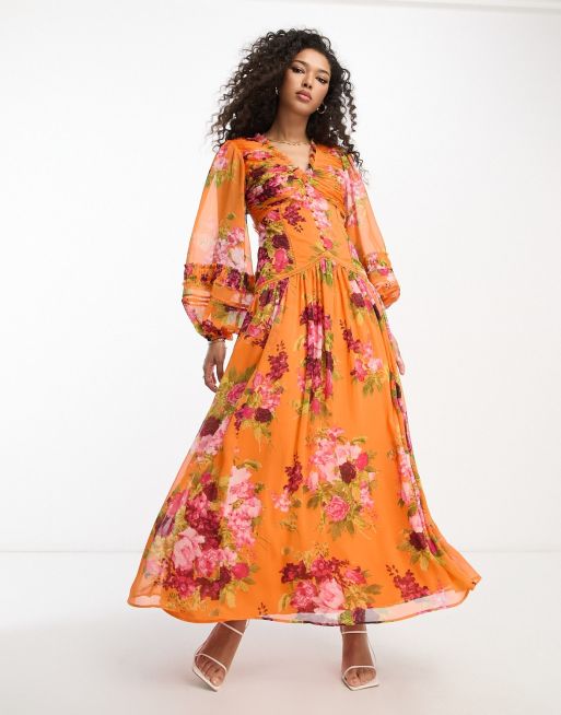 ASOS DESIGN button through pintuck maxi dress with lace inserts in orange floral print