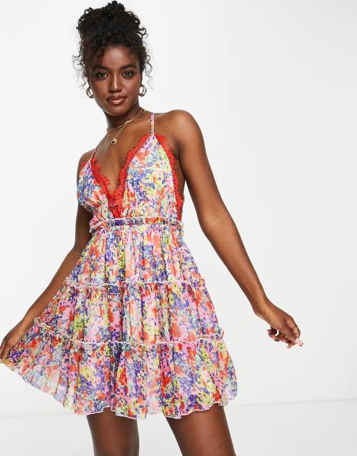 ASOS DESIGN button through tiered lace trim mini dress in floral print