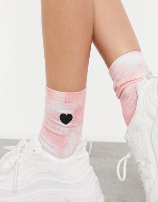 ASOS DESIGN calf length rib tie dye sock with heart embroidery