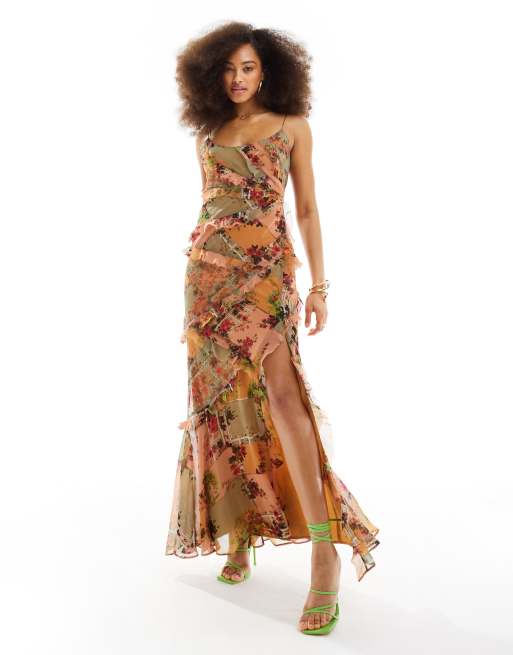 ASOS DESIGN cami bias maxi dress with ruffles with patched lace in mixed floral print