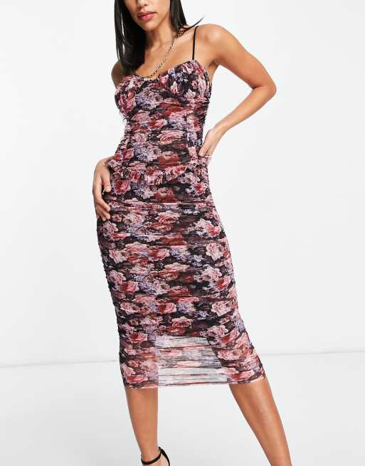 ASOS DESIGN cami ruched mesh midi dress in dark floral print