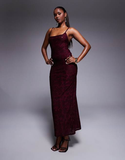 ASOS DESIGN cami square neckline sheer devore midi dress in wine