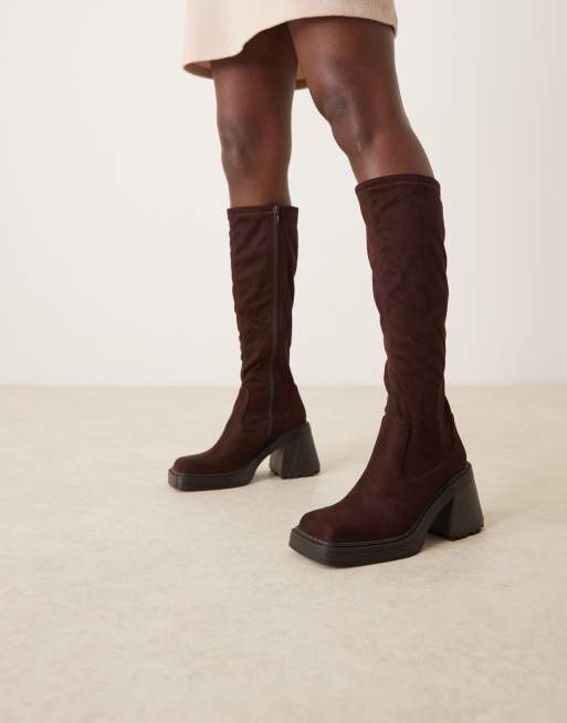 ASOS DESIGN Charly heeled knee boots in chocolate suedette