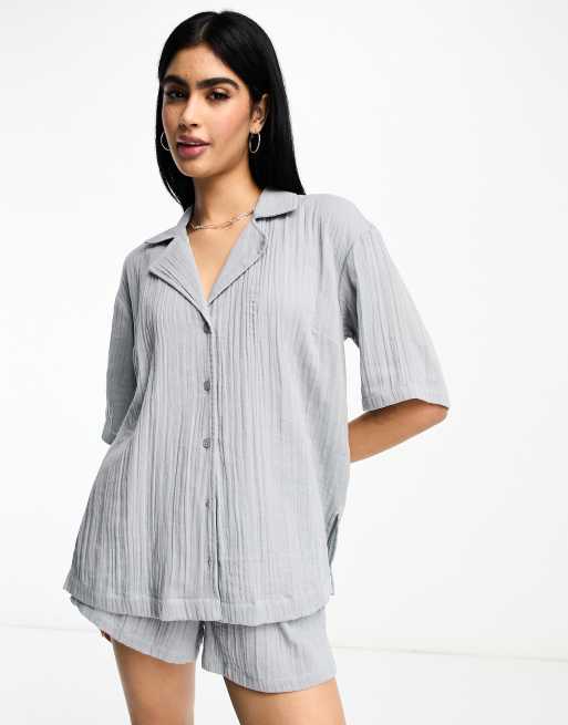 ASOS DESIGN cheesecloth bowling shirt in grey co-ord
