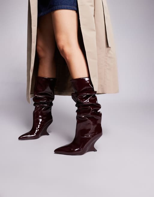ASOS DESIGN Cheryl wedge slouch knee boots in burgundy