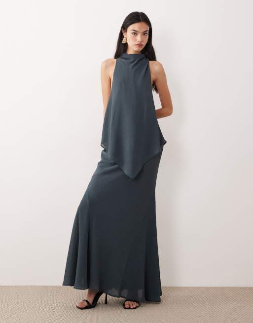 ASOS DESIGN chiffon high neck double layer maxi dress in charcoal grey